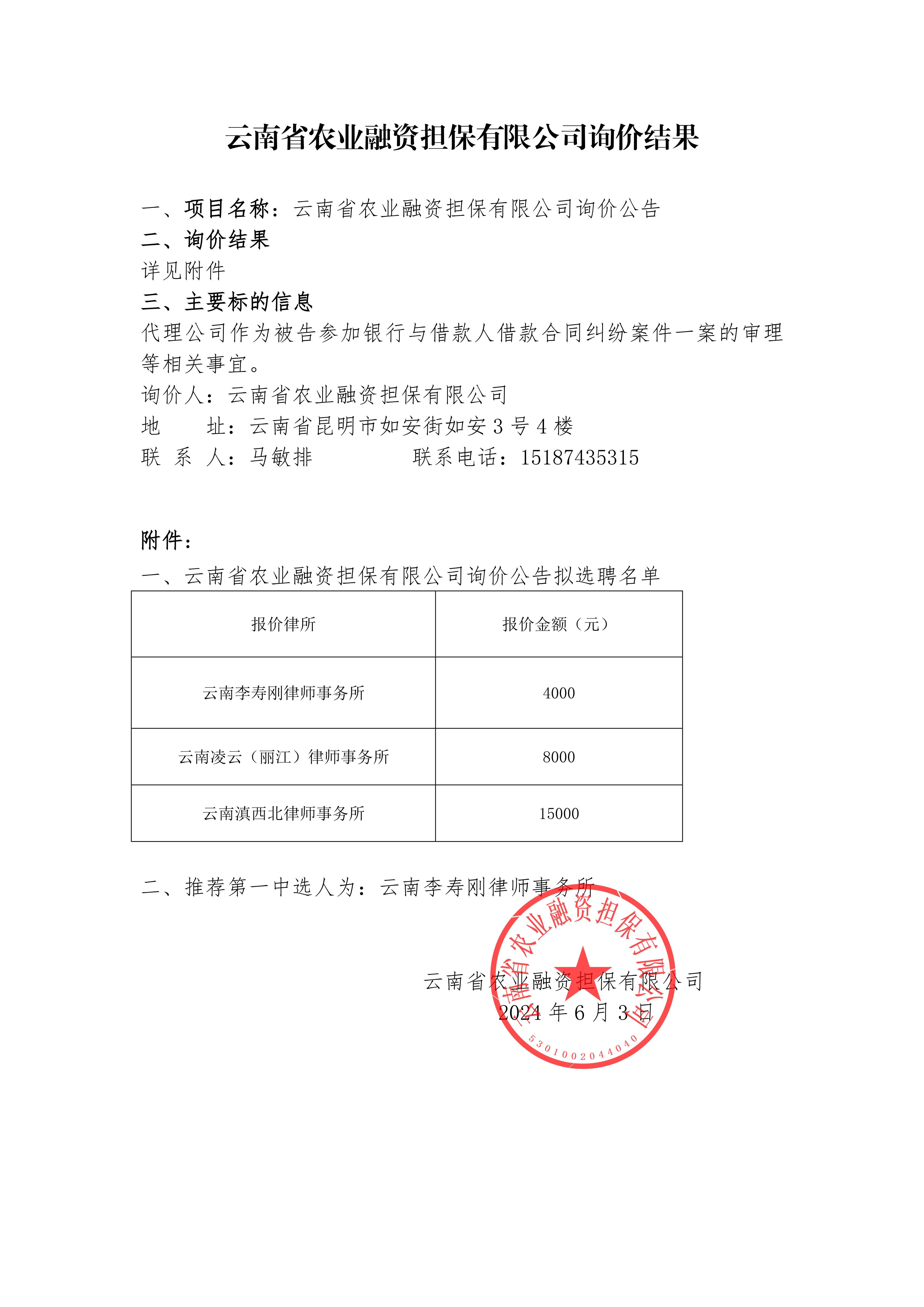云南省農(nóng)業(yè)融資擔(dān)保有限公司詢價(jià)結(jié)果