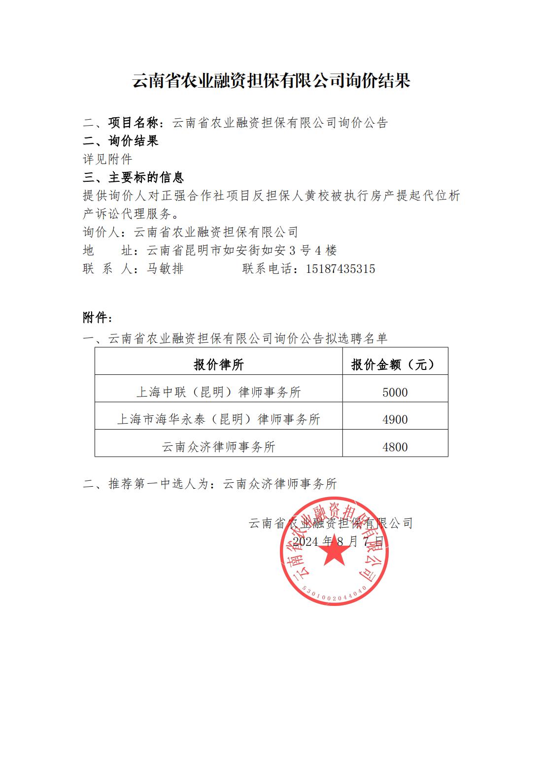 云南省農(nóng)業(yè)融資擔(dān)保有限公司詢(xún)價(jià)結(jié)果