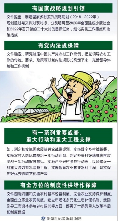 ——有一系列重要戰(zhàn)略、重大行動和重大工程支撐。如,制定和實施國家質(zhì)量興農(nóng)戰(zhàn)略規(guī)劃、實施數(shù)字鄉(xiāng)村戰(zhàn)略等,實施農(nóng)村人居環(huán)境整治三年行動計劃、制定堅決打好精準脫貧攻堅戰(zhàn)三年行動指導(dǎo)意見、實施產(chǎn)業(yè)興村強縣行動等,以及建設(shè)一批重大高效節(jié)水灌溉工程、實施智慧農(nóng)業(yè)林業(yè)水利工程、切實保護好優(yōu)秀農(nóng)耕文化遺產(chǎn)等。