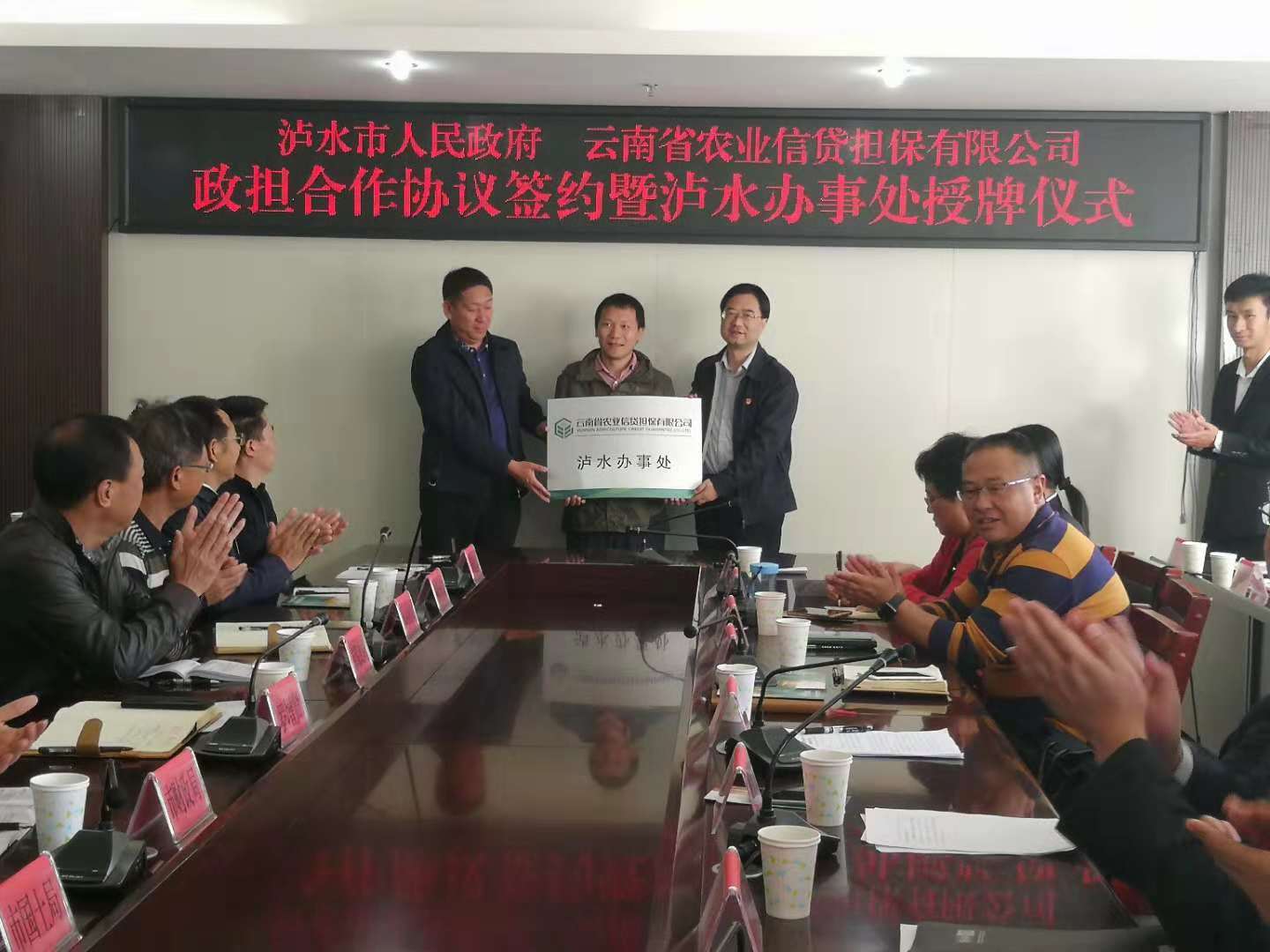 10月24日上午,云南省農(nóng)業(yè)信貸擔(dān)保有限公司瀘水辦事處授牌儀式在瀘水市人民政府正式舉行,瀘水市市委常委、常務(wù)副市長羅增賢同志、公司董事長郭影、副總經(jīng)理廖寅皓出席儀式。