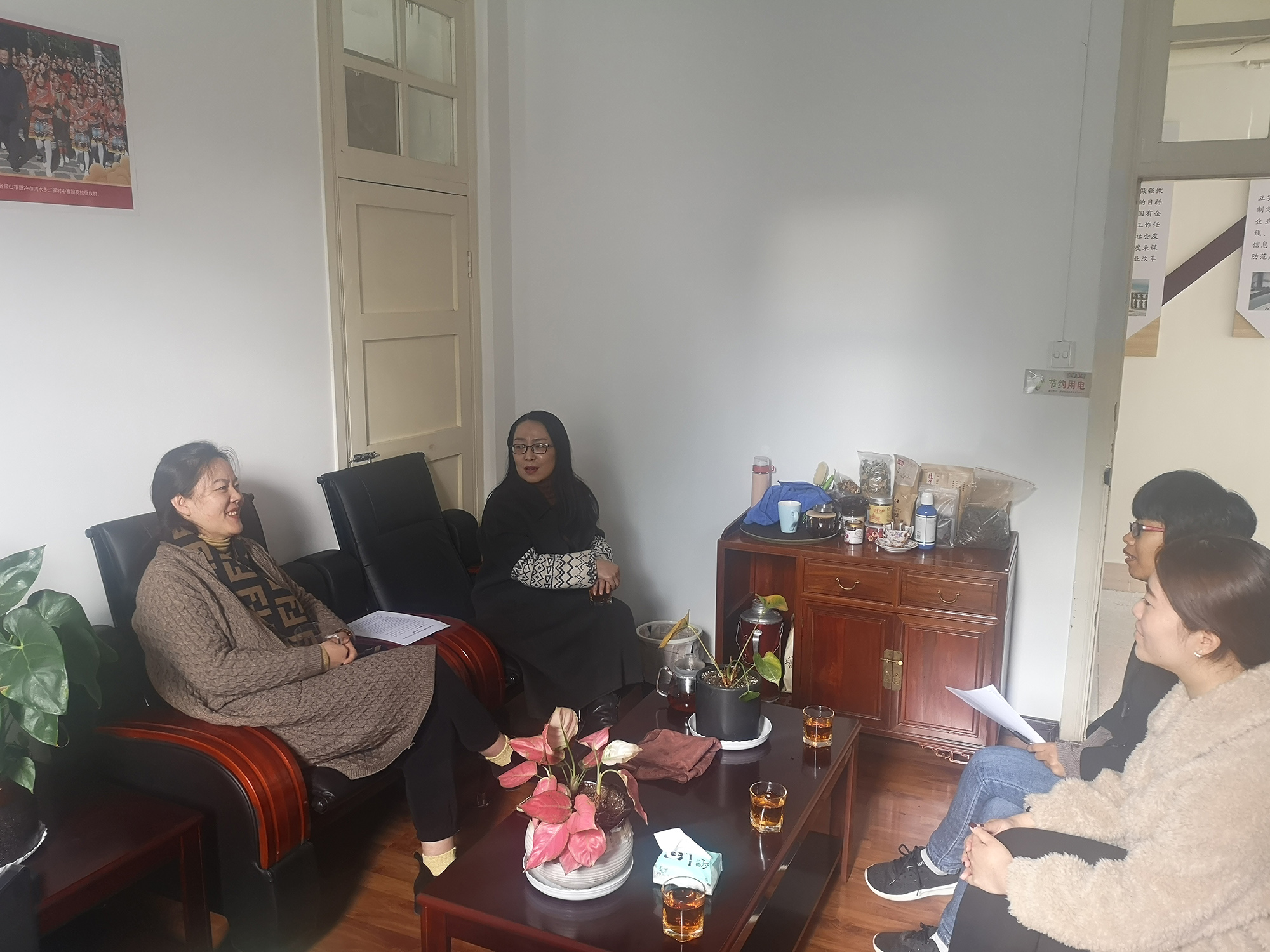 2020年12月24日,保山辦事處副主任胡幫露攜項(xiàng)目經(jīng)理竇云云、楊埒到騰沖市財(cái)政局向局長(zhǎng)谷紹權(quán)、副局長(zhǎng)楊俐做年度工作匯報(bào)。
